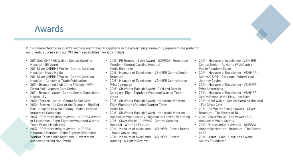 mpiTOO has been recognized with over a hundred awards from MASHAMD (Mid-Atlantic Society for Healthcare and Medical Development), The Asters (healthcare awards), NCPRSA (Public Relations Society of America), CHPRMS (Carolinas Healthcare Public Relations & Marketing Society), Virginia PRSA, Ad Club of the Triangle, and The Raleigh Public Relations Society.